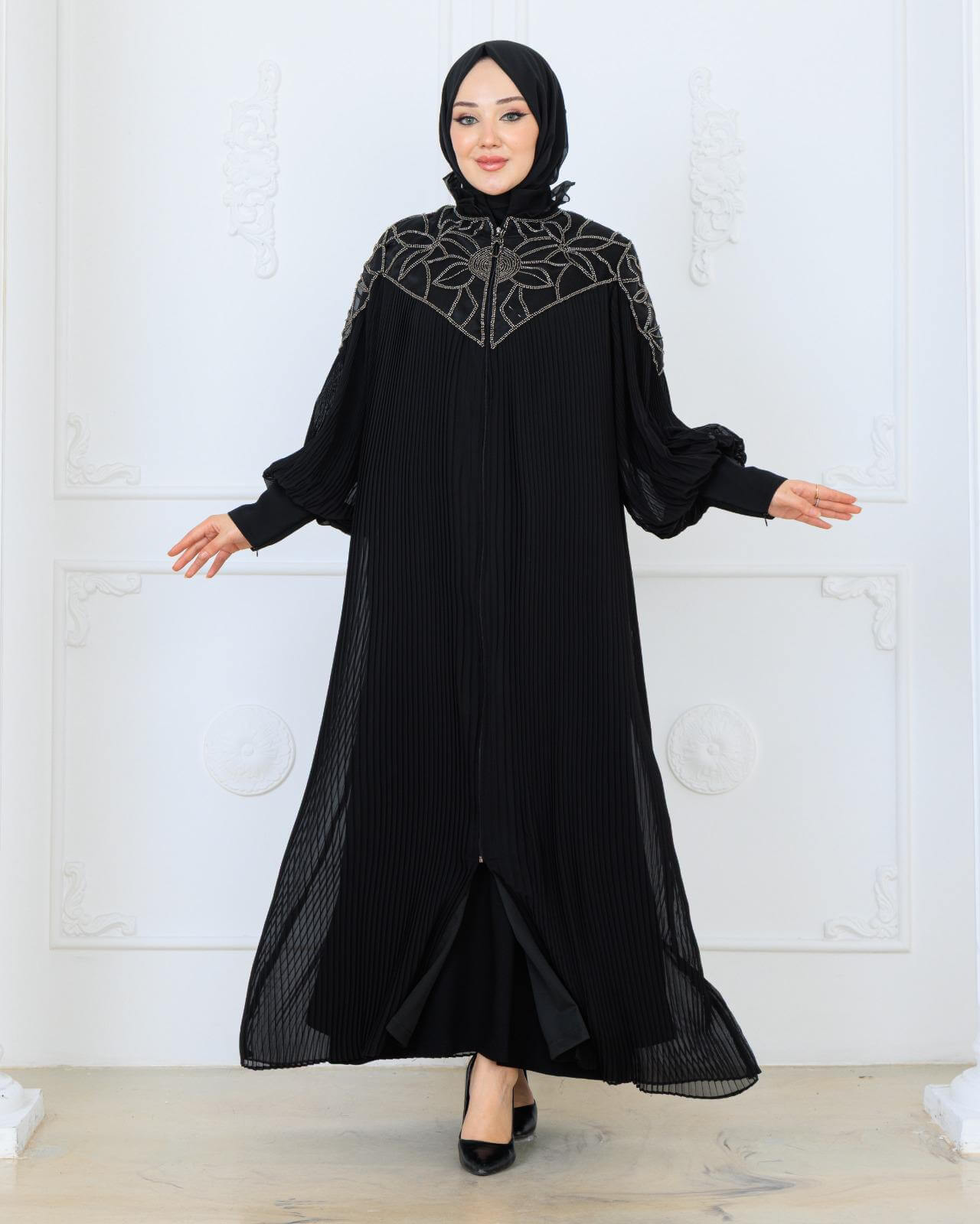 Royal abaya, Kumaş şifon viskon, hafif ve akıcı yapısı sayesinde gün boyu konfor sunarken zarif dokusuyla şıklığı ön plana çıkarır. Tek parça astarlı. Günlük kombinlerden özel davetlere kadar geniş bir kullanım alanına sahip olan bu kumaş, dökümlü duruşu sayesinde abaya ve ferace tasarımlarında estetik bir görünüm sağlar. Modern ve zamansız yapısıyla her mevsim rahatlıkla tercih edilebilir, Es-Sahra kalitesiyle uzun süreli ve keyifli bir kullanım sunar.
