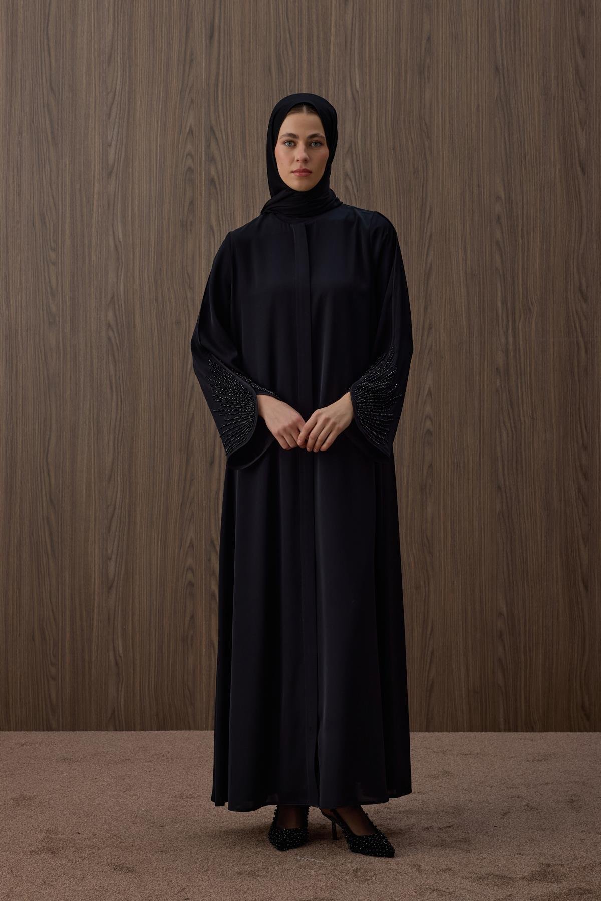 Ürün açıklaması: Ürünümüzün kumaşı dubai ipeğidir. Meva Feracemiz önden gizli fermuarlıdır.Kol ucunda el işlemesi kristal taşlar vardır.Boyu 145 cmdir.